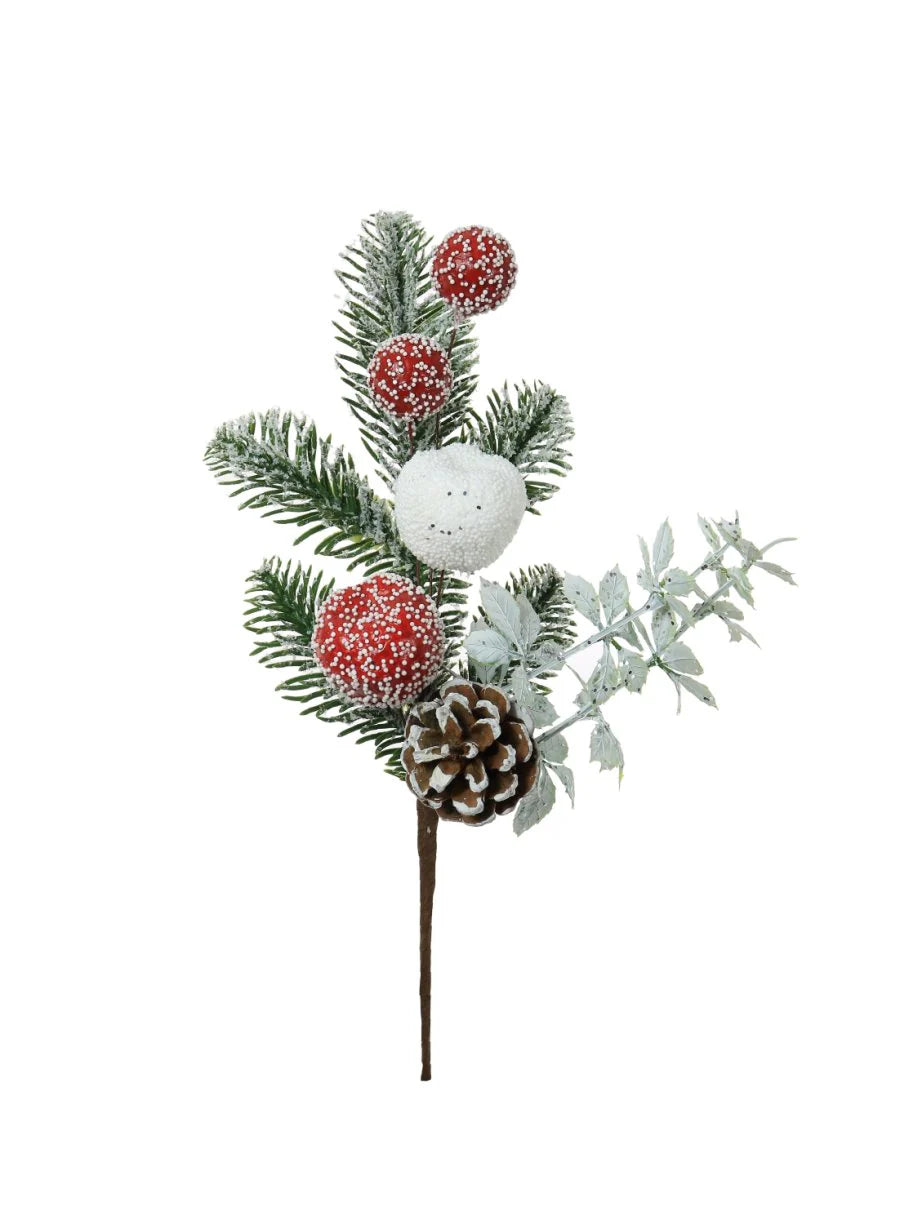 Red and white artificial fruit and pinecone pick.
